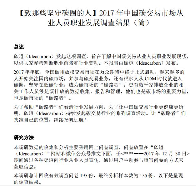 中國(guó)碳匯林訊  碳道團(tuán)隊(duì)對(duì)國(guó)內(nèi)碳圈行業(yè)進(jìn)行了2017年中國(guó)碳交易市場(chǎng)從業(yè)人員職業(yè)發(fā)展調(diào)查,現(xiàn)對(duì)調(diào)查結(jié)果公布如下。見(jiàn)附件。(中國(guó)碳匯林網(wǎng))